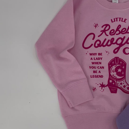 Unleash your inner cowgirl with our bestselling sweatshirt! Available in pink or purple, our magenta cowgirl print reads "little rebel cowgirl club." Why be a lady when you can be a legend?