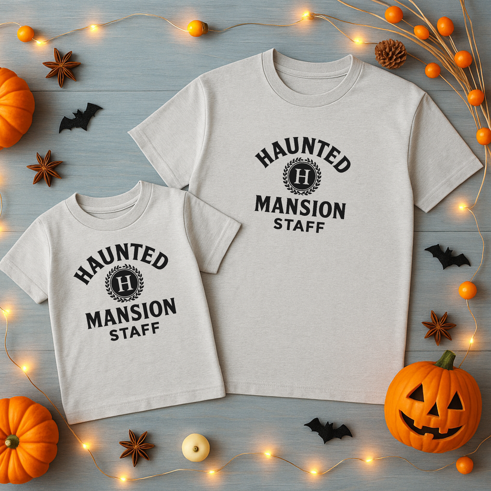 Celebrate spooky season in style with our Custom Haunted Mansion Staff Tee in shimmering silver. This unisex shirt is perfect for trick-or-treat adventures or haunted house fun. Personalize yours with your name (on back) and allow at least a week for customization, making your Halloween outfit truly one of a kind!
