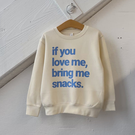 If You Love Me Bring Me Snacks Sweatshirt Upgrade your favorite tee to ultimate comfort with this cozy sweatshirt featuring our best-selling design. The playful "If You Love Me Bring My Snacks" message appears in a beautiful blue print against a soft off-white base, perfect for snack lovers and humor enthusiasts alike. Ideal for casual hangouts, lazy days, or gifting to that special someone who truly understands your priorities. Wrap yourself in warmth and personality.